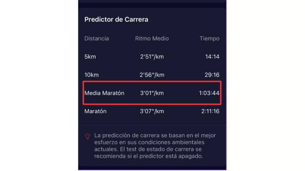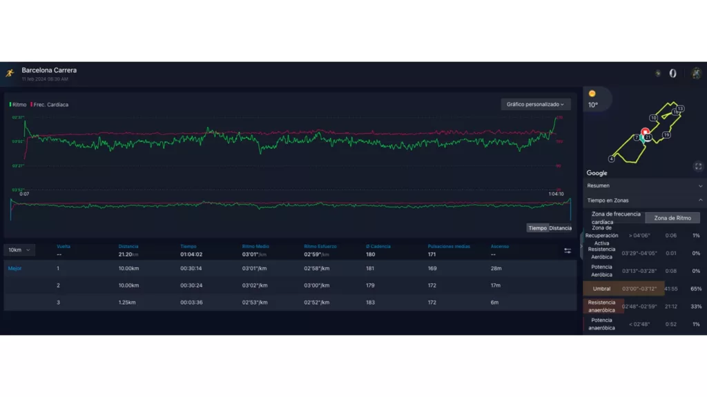 Con todo esto, y de cara al fin de semana de la Mitja Marató de Barcelona, el predictor de carrera de Alex estimaba que conseguiría cubrir esa distancia en 1:03:44. Esta es una de las herramientas que Alex utiliza, especialmente de cara al día de la carrera. Así lo explicaba el corredor: «según mi predicción COROS con el nuevo POD 2, podría intentar correr sobre 3.01/3.02 los 21km, ya que los datos del Training hub me mostraban el ritmo umbral en 3.00, esto me dio mucha confianza para afrontar la carrera».