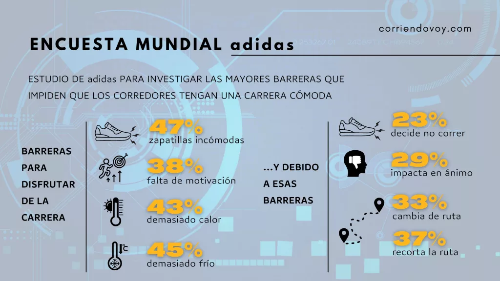 adidas hizo una investigación a nivel global, y tras encuestar a 2.674 corredores en 11 ciudades del mundo, el estudio ha revelado que una zapatilla incómoda es el mayor inconveniente a la hora de disfrutar de una carrera para un 47% de usuarios. Existen otros obstáculos a la hora de salir a correr, como el calor (45%) o el frío (43%) excesivo. También la falta de motivación supone un hándicap para el 38% de encuestados.